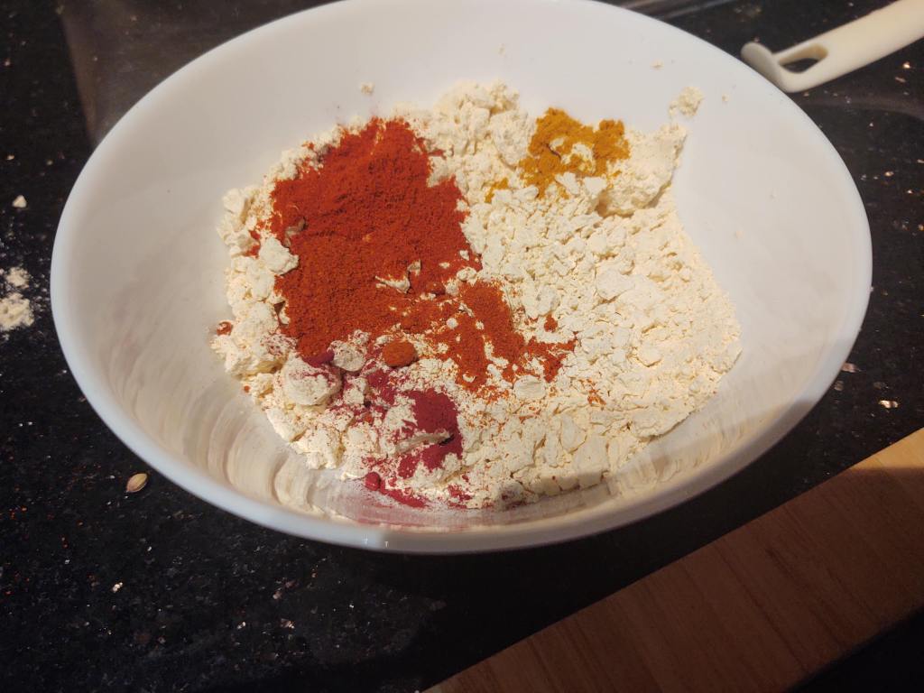 2. Mix together gram flour, red chilli powder/paprika, turmeric powder and salt.