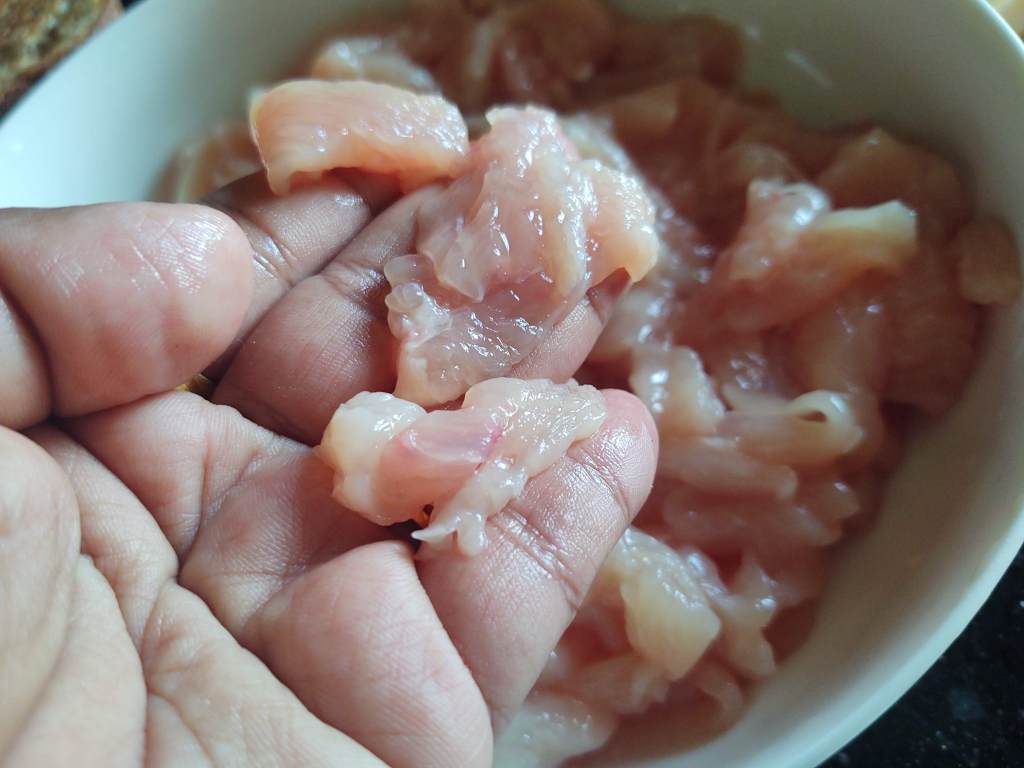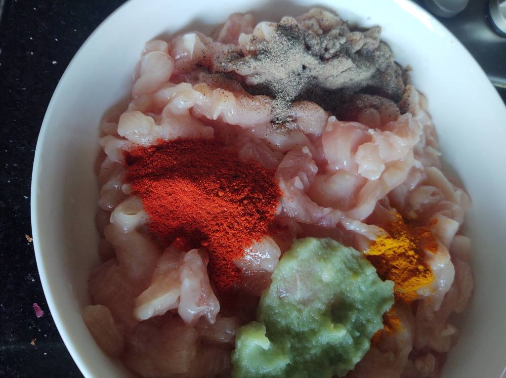 2. Marinate the strips with 1 tsp salt, ginger garlic paste, red chilli powder, pepper powder, lime juice and turmeric powder. Refrigerate for about 30 minutes to 1 hour.