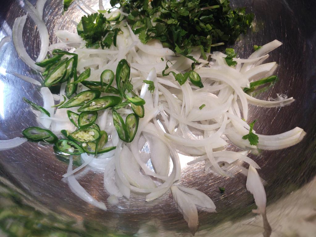 3. In a separate bowl, take the thinly sliced onion, green chillies and finely chopped coriander.