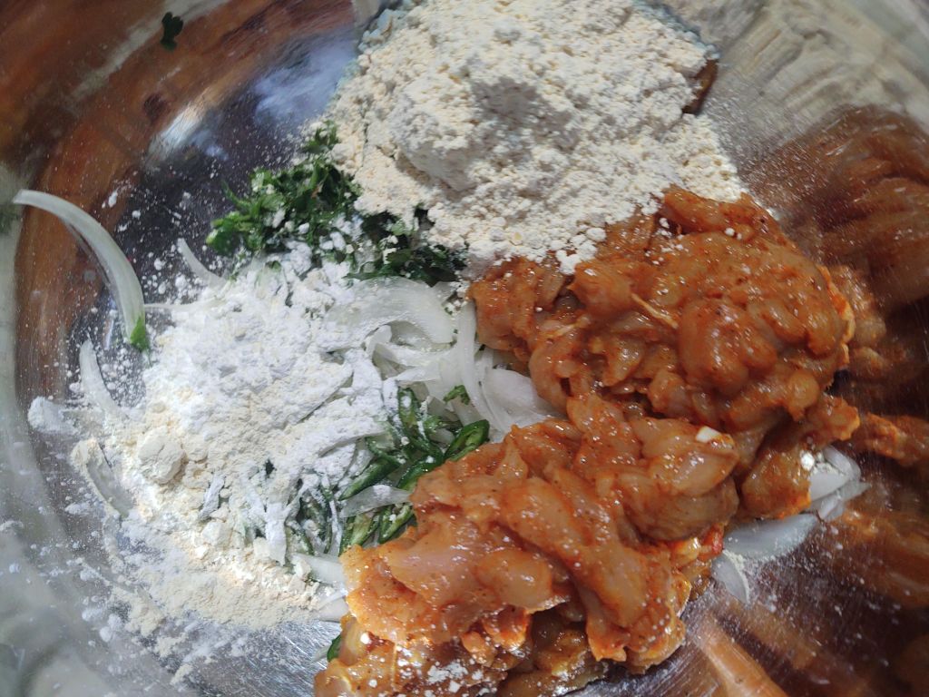 4. Add the gram flour, corn flour/rice flour and the marinated chicken. Add about ½ tsp salt.